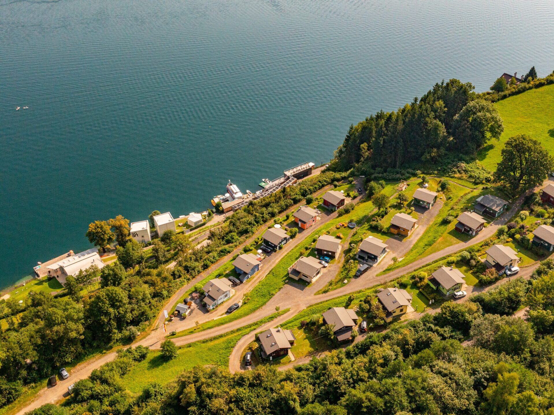 Wie eine Arena schmiegen sich die Lodges und die bunten Boutique-Chalets an den Hang direkt oberhalb des Südufers und geben den Blick auf die Seebühne frei.